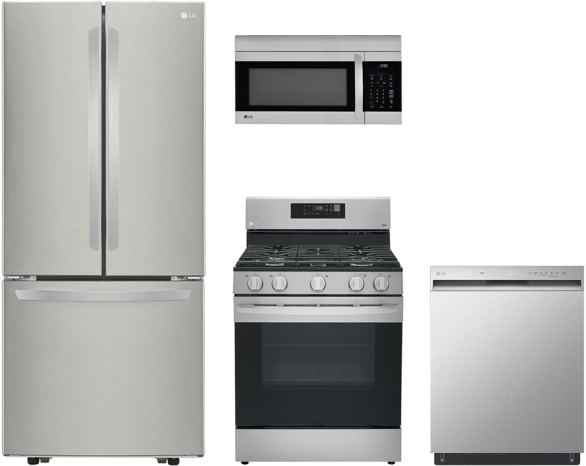 LG 4 Piece Stainless Steel Kitchen Package with French door refrigerator, freestanding gas range, built in dishwasher, and over the range microwave.Read More